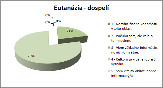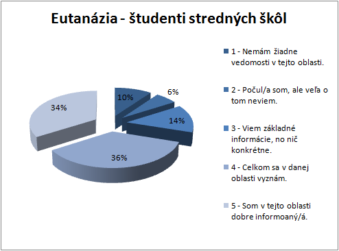 10% študentov stredných škôl označilo rozsah svojich vedomostí o eutanázii číslom 1; 6% študentov číslom 2; 14% číslom 3; 36% číslom 4 a 34% študentov si myslí, že sú o eutanázii dobre informovaní a v otázke označili číslo 5. (Príloha A, Graf 9)