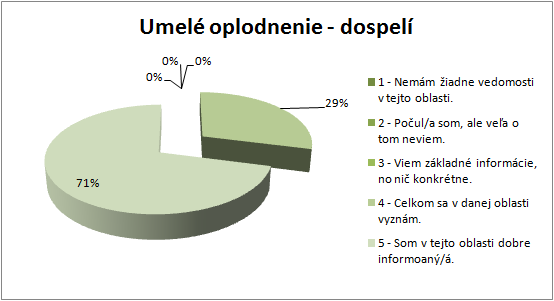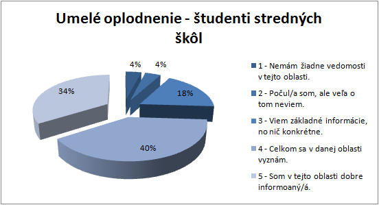 4% študentov stredných škôl označilo rozsah svojich vedomostí o umelom oplodnení číslom 1; 4% študentov číslom 2; 18% číslom 3; 40% číslom 4 a 34% študentov si myslí, že sú o umelom oplodnení dobre informovaní a v otázke označili číslo 5. (Príloha A, Graf 13)